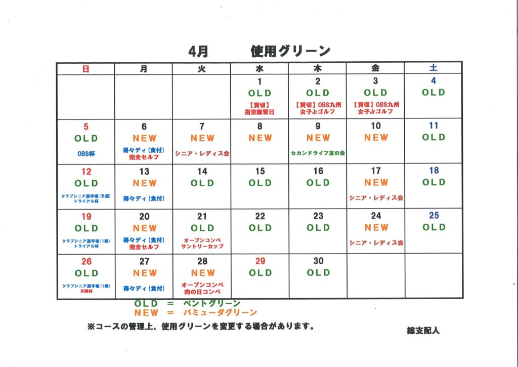2026年4月 グリーン日程表 4月の使用グリーン表になります。 4日程表をPDFで確認 ※コースの管理上、使用グリーンを変更する場合があります。 総支配人 3月のグリーン表はこちら TOPページに戻る